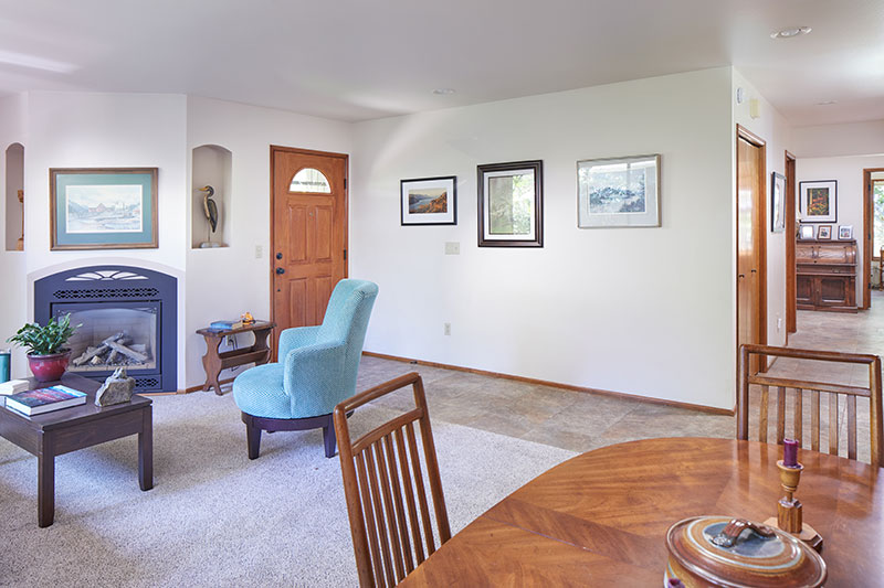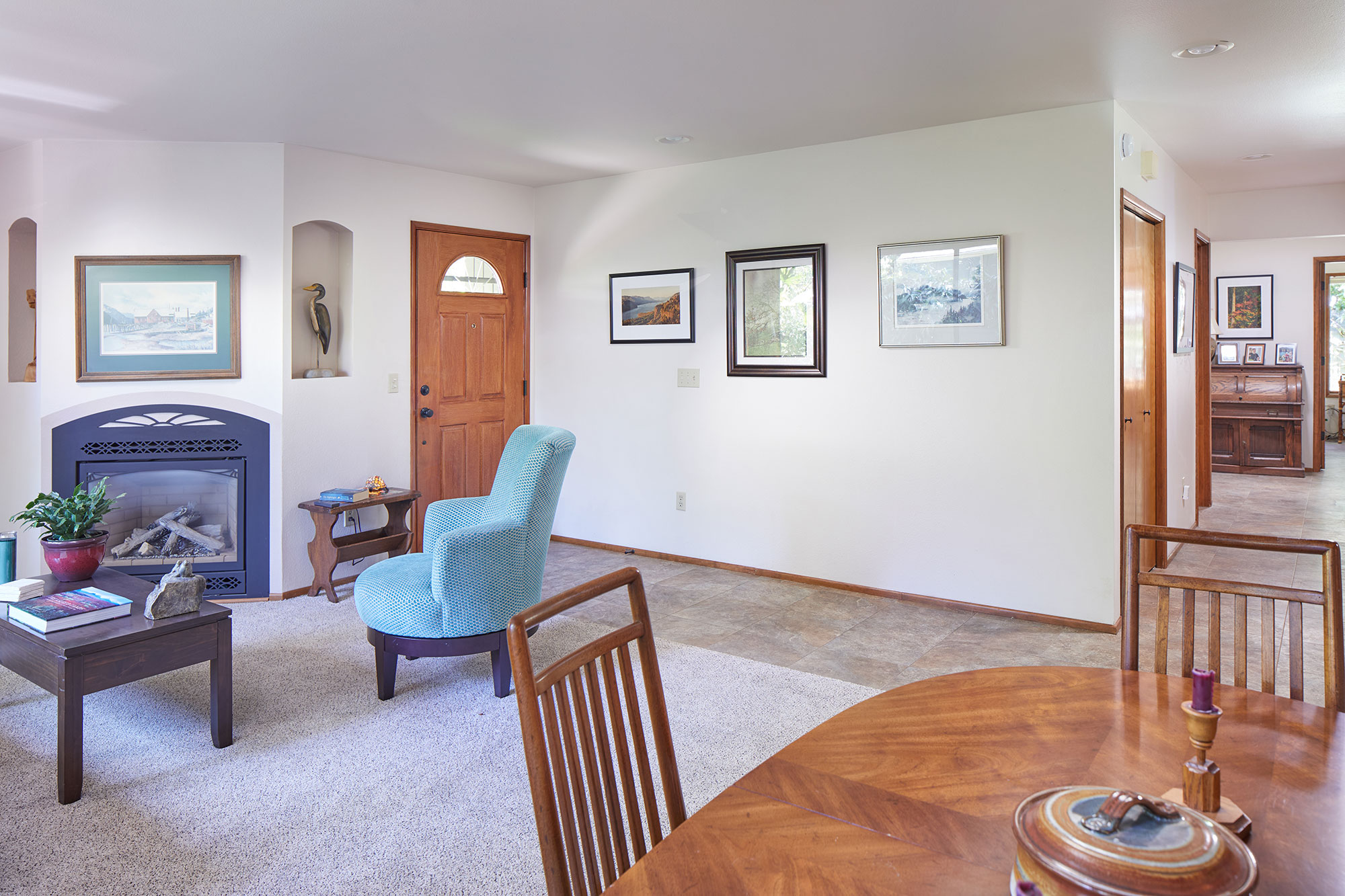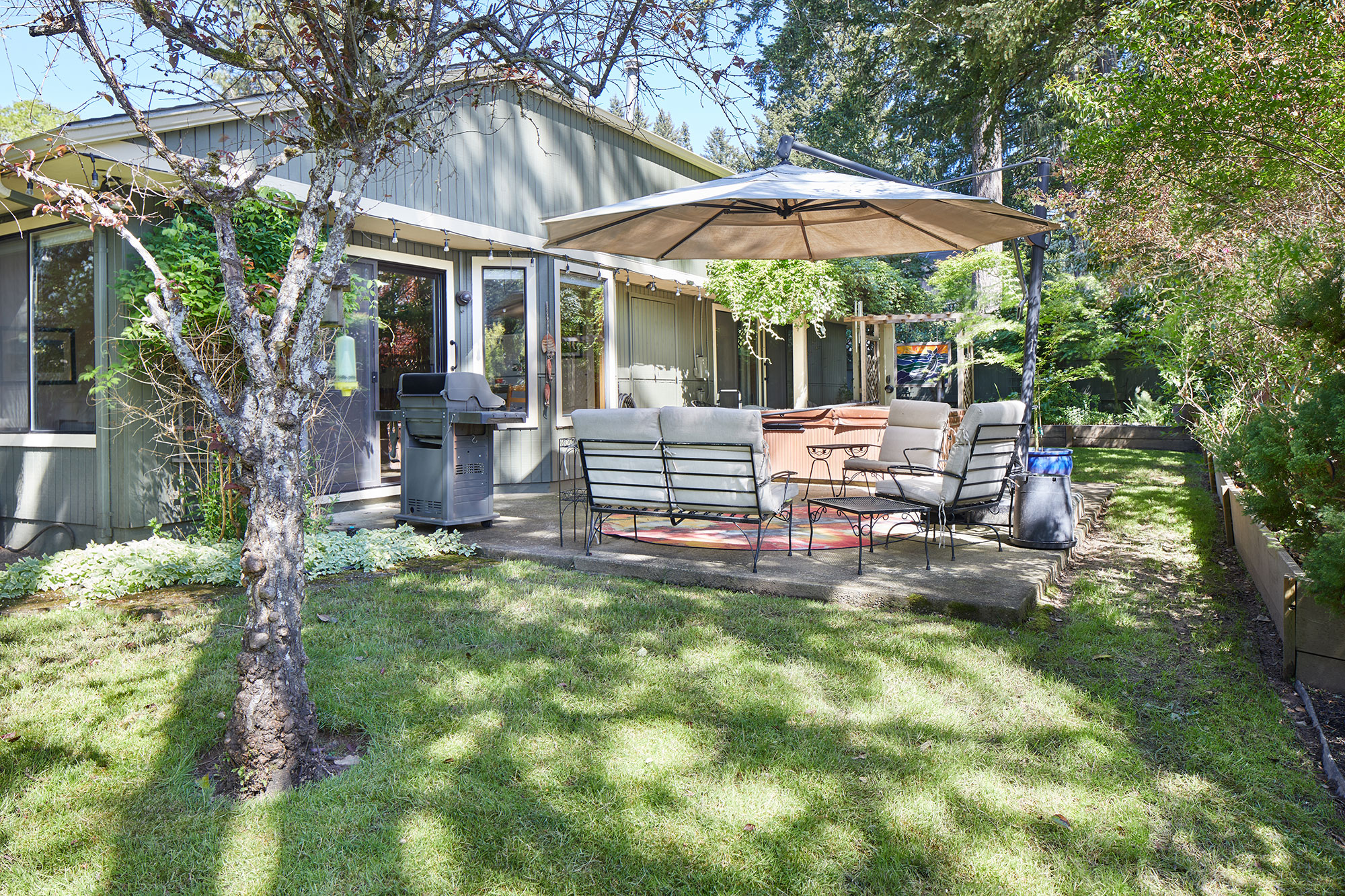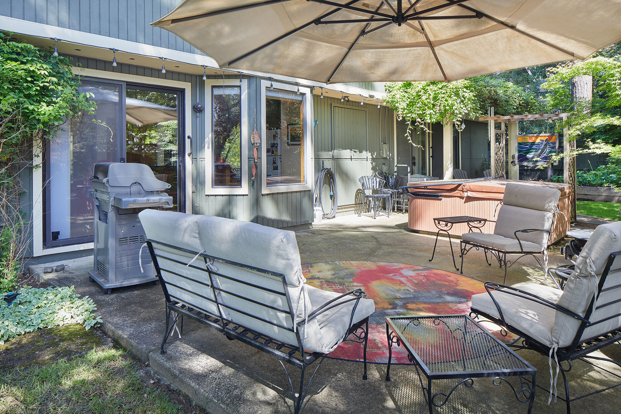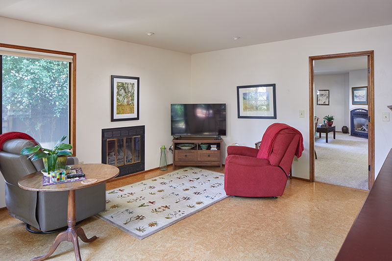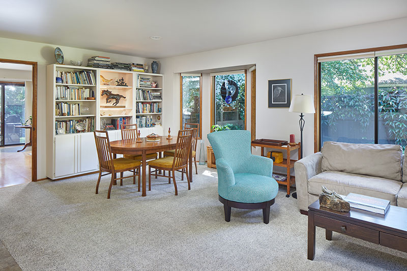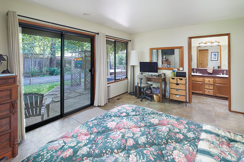 One of a kind gracious single level home steps from Woodland Park. Formal, fenced private oasis entry courtyard. Wonderful floor plan with living room and open concept kitchen-family room. Two gas fireplaces. Adura Luxury vinyl, cork and carpet flooring. Primary suite bedroom with slider to private vine covered patio. Many upgrades and updates. Park like grounds visible from abundant large windows. Gas forced air heat and newer a/c. Home was originally four bedrooms, one wall removed to make larger bedroom with skylights.