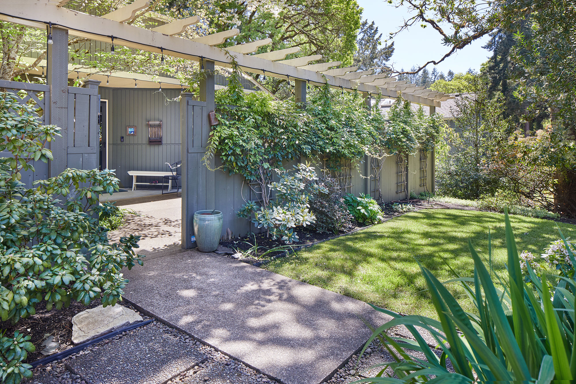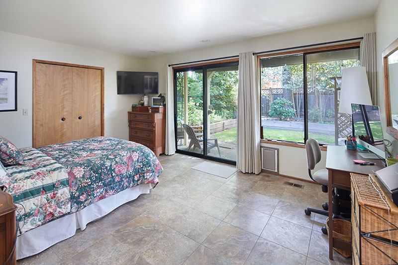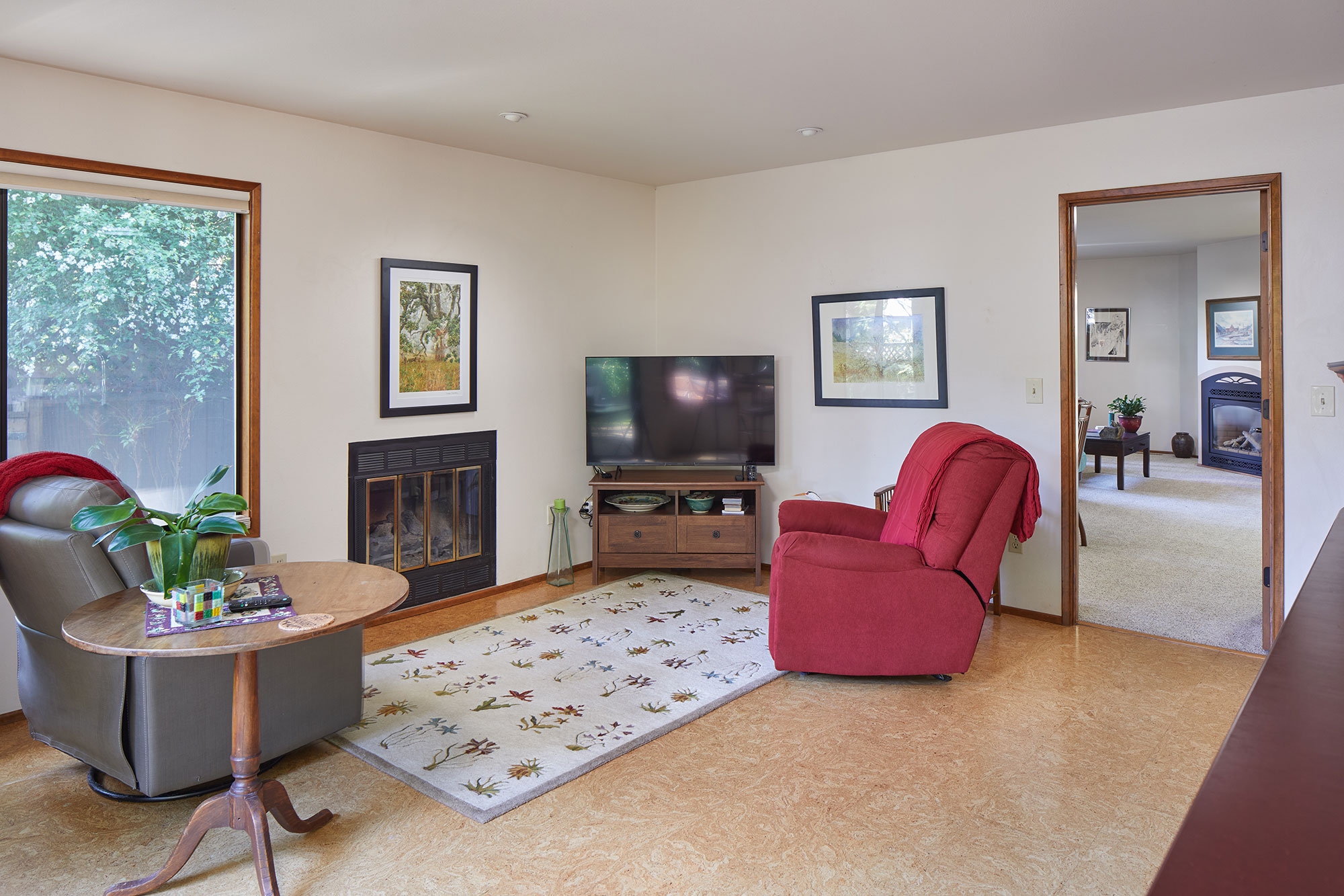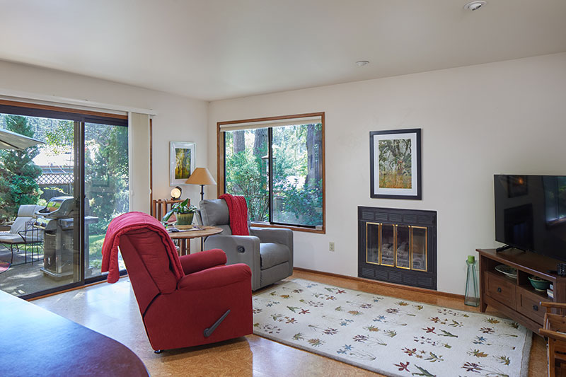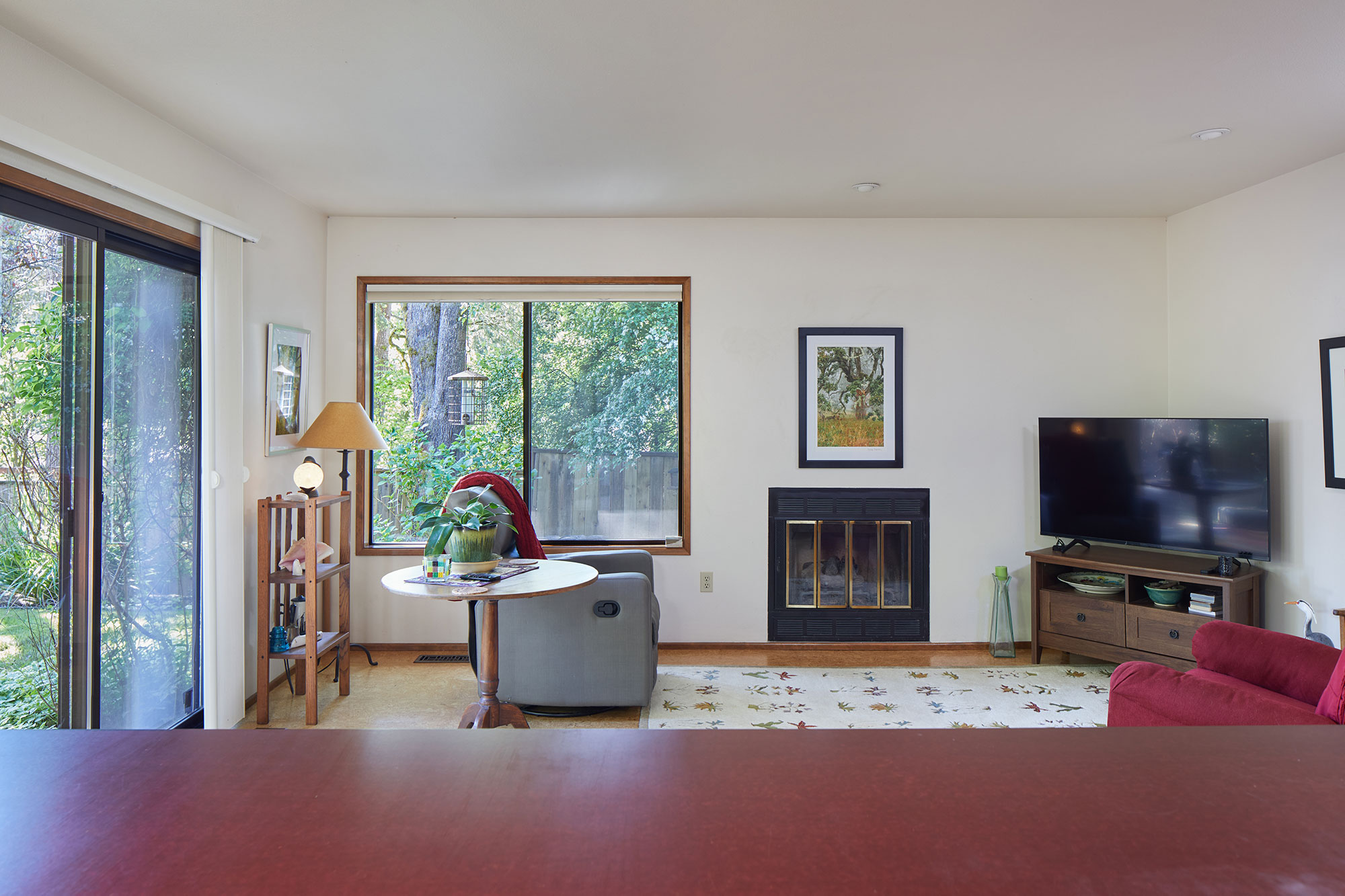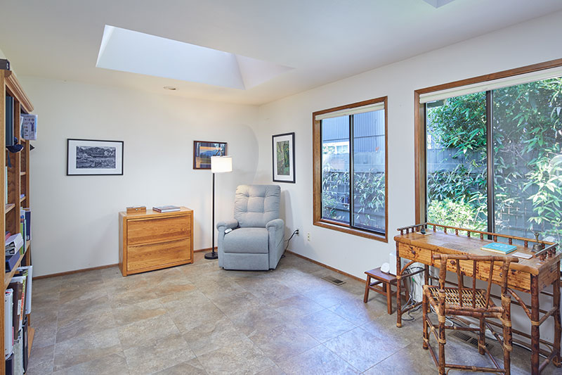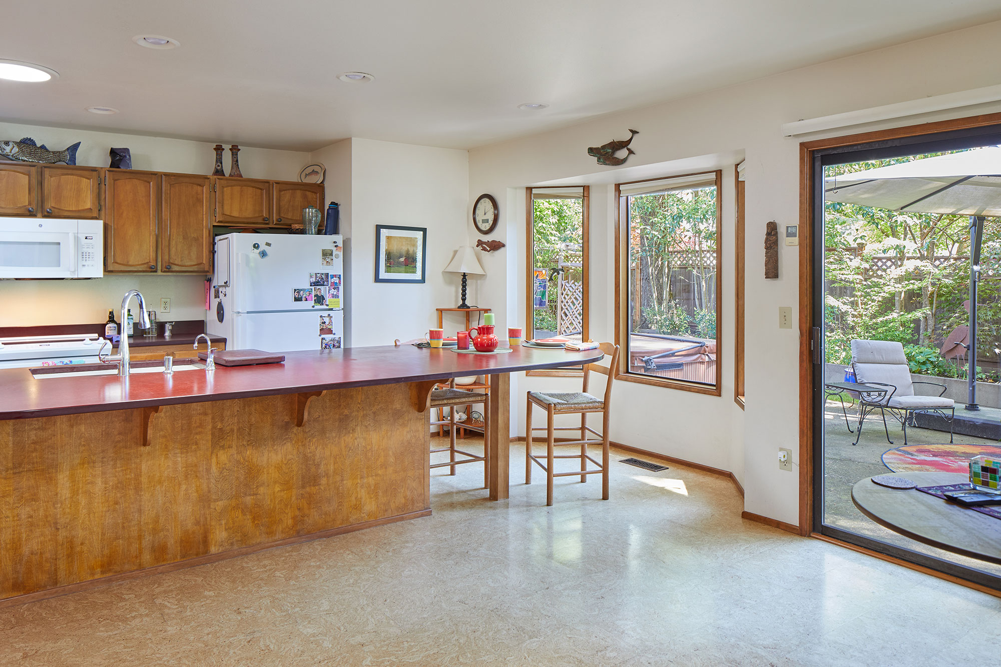 One of a kind gracious single level home steps from Woodland Park. Formal, fenced private oasis entry courtyard. Wonderful floor plan with living room and open concept kitchen-family room. Two gas fireplaces. Adura Luxury vinyl, cork and carpet flooring. Primary suite bedroom with slider to private vine covered patio. Many upgrades and updates. Park like grounds visible from abundant large windows. Gas forced air heat and newer a/c. Home was originally four bedrooms, one wall removed to make larger bedroom with skylights.