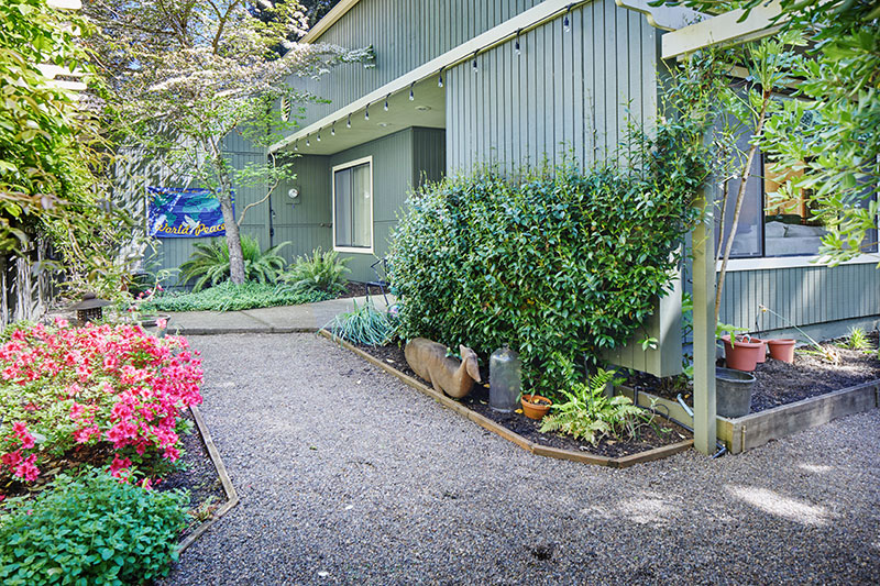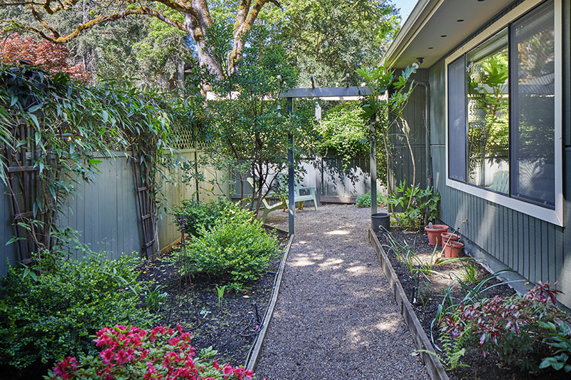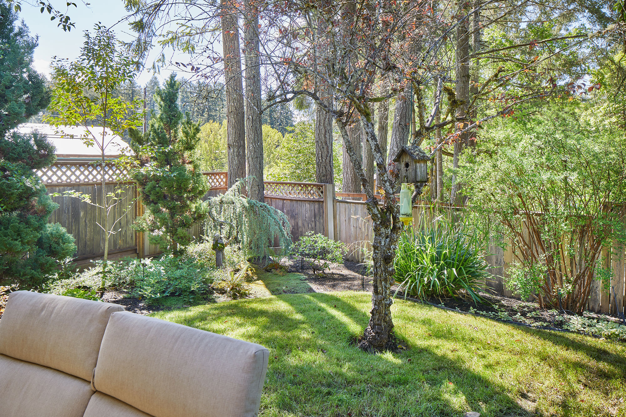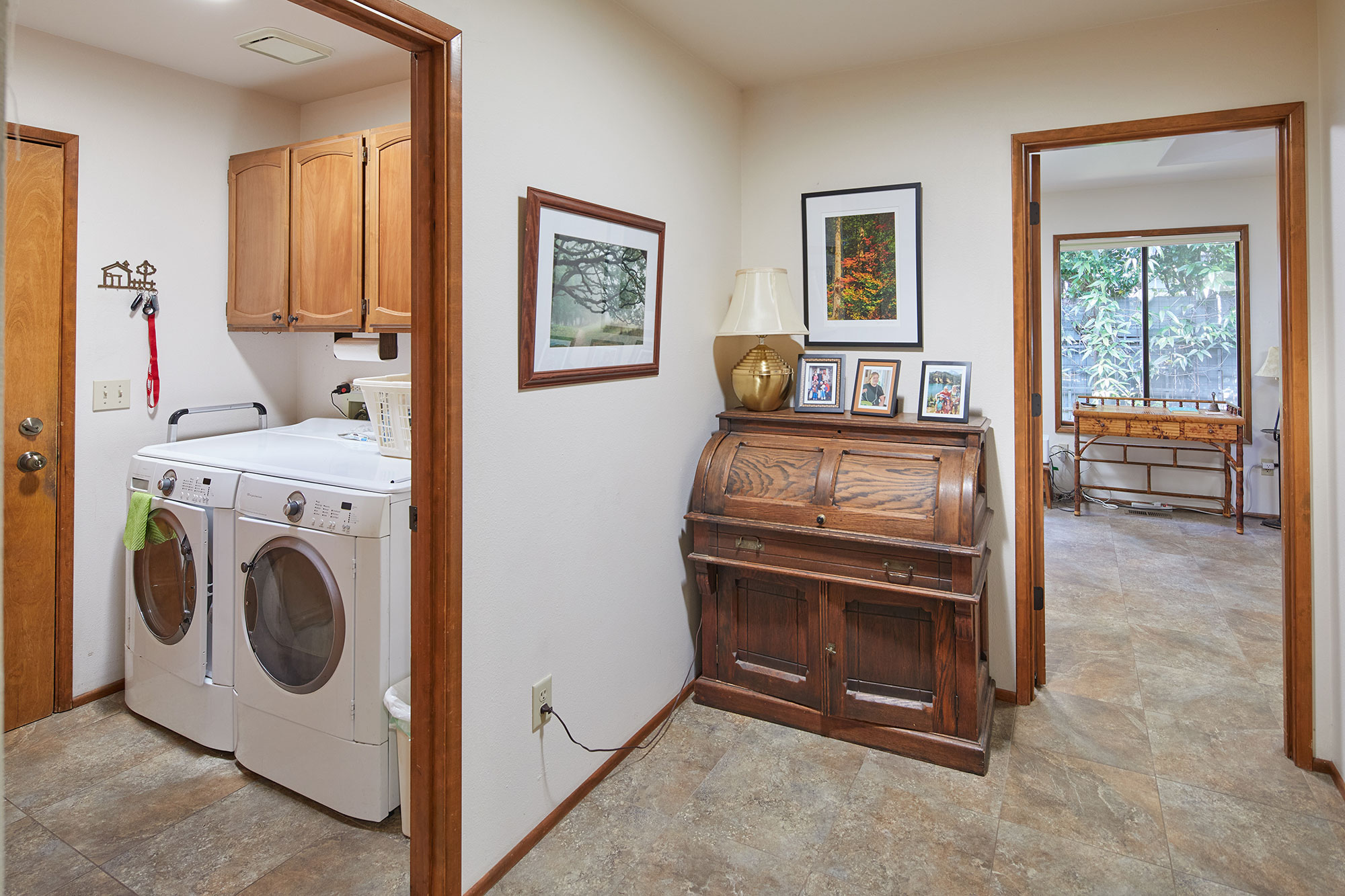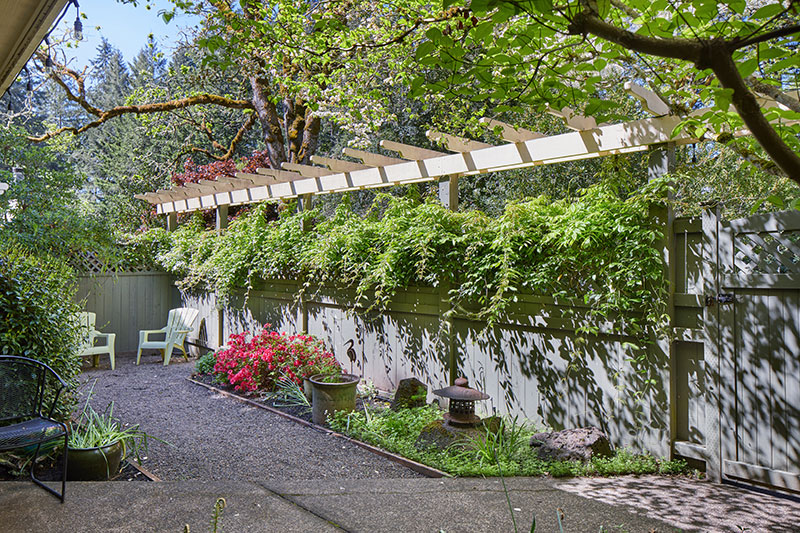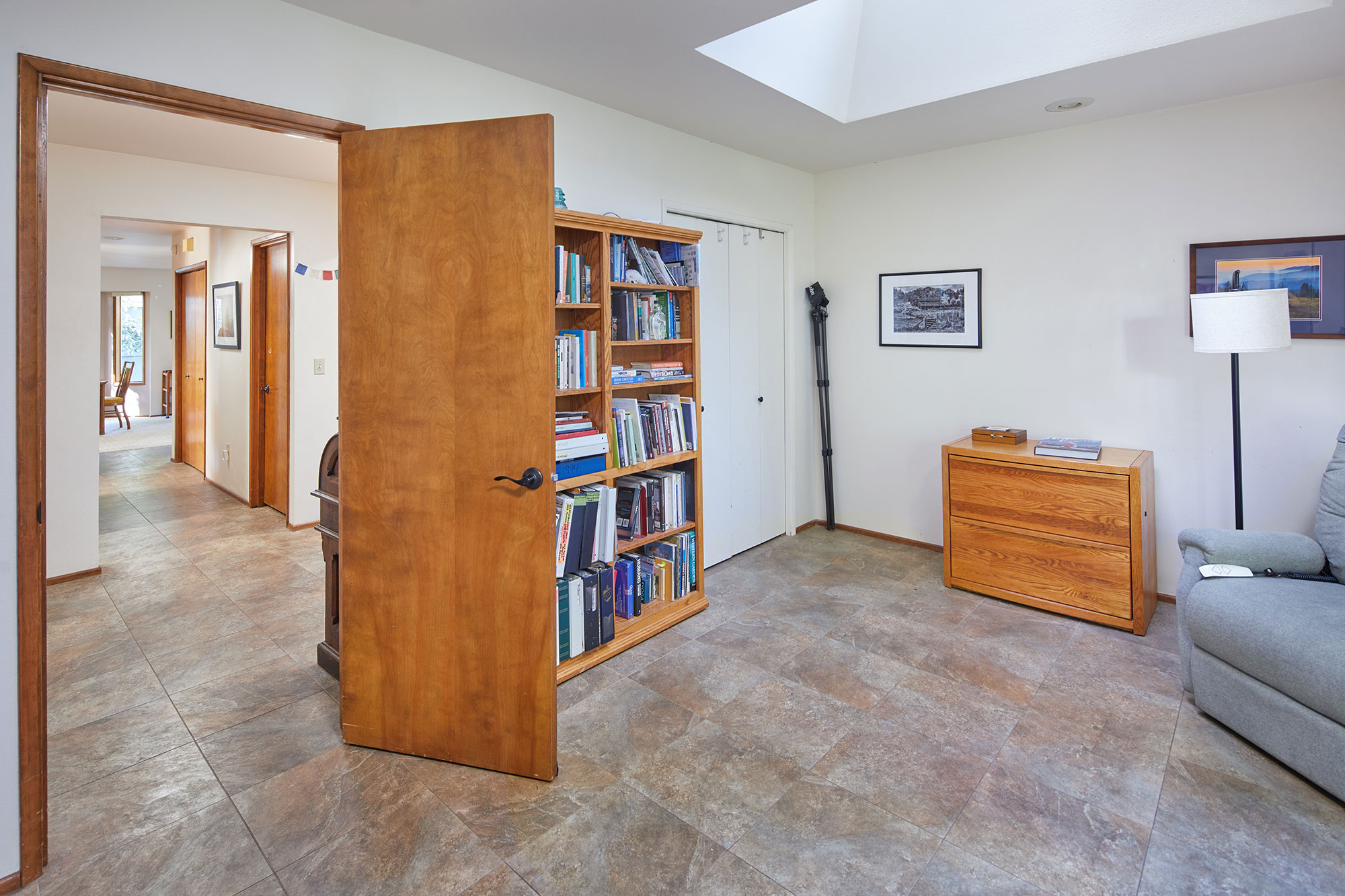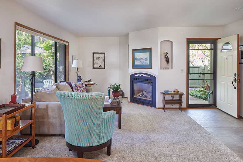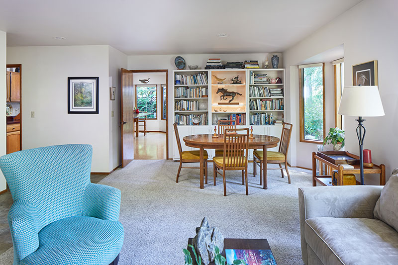 One of a kind gracious single level home steps from Woodland Park. Formal, fenced private oasis entry courtyard. Wonderful floor plan with living room and open concept kitchen-family room. Two gas fireplaces. Adura Luxury vinyl, cork and carpet flooring. Primary suite bedroom with slider to private vine covered patio. Many upgrades and updates. Park like grounds visible from abundant large windows. Gas forced air heat and newer a/c. Home was originally four bedrooms, one wall removed to make larger bedroom with skylights.